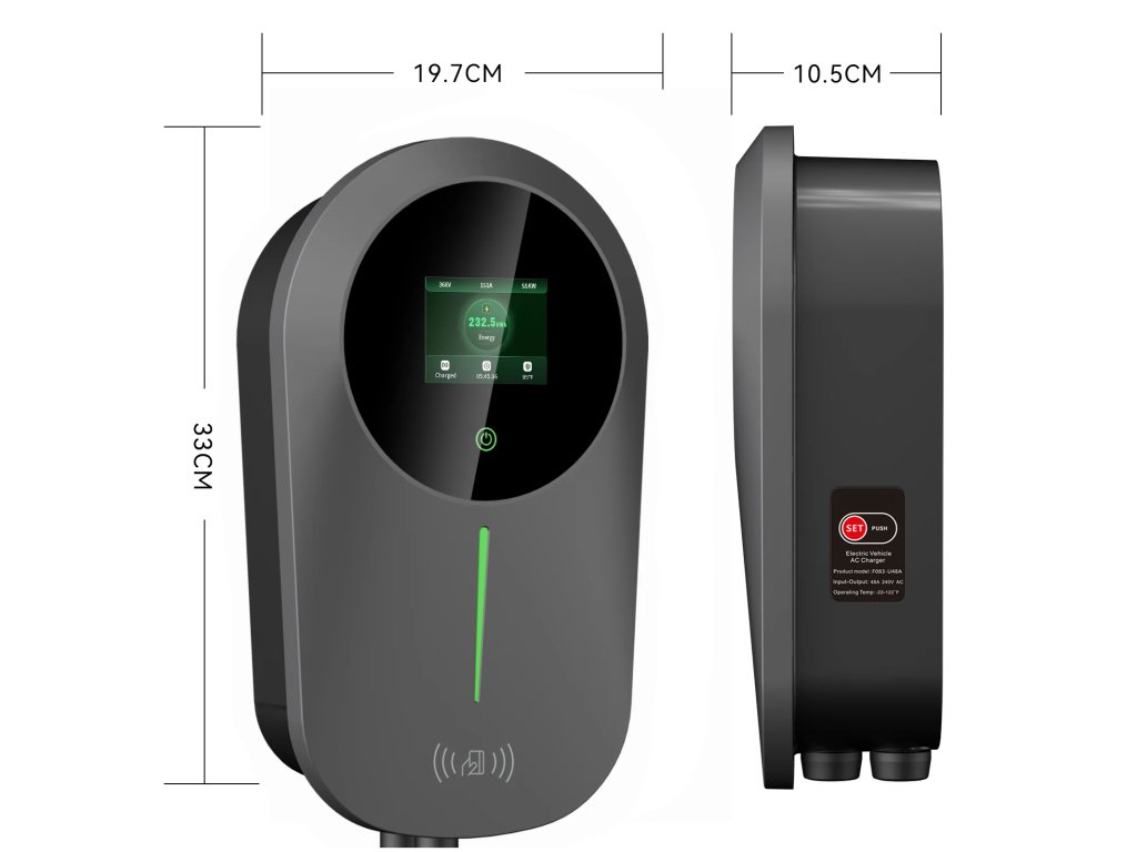 - Podświetlany wyświetlacz z informacjami o czasie ładowania, mocy, napięciu, dostarczonej energii, temperaturze, sygnale Wi-Fi i ikonami trybów