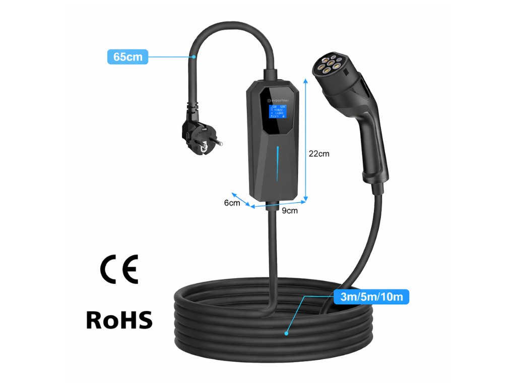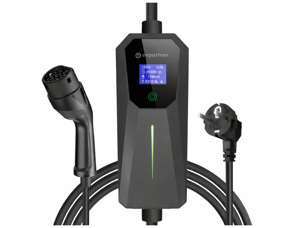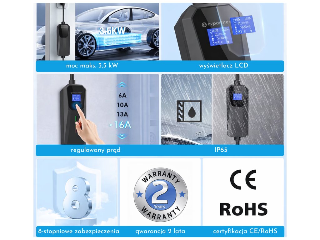 Wysokiej jakości ładowarka do standardowego gniazdka 230 V, niemiecka jakość, kompatybilna z większością pojazdów elektrycznych EV i hybryd PHEV. Regulowana moc ładowania: 6A, 8A, 10A, 13A, 16A; minimalna moc 1,2 kW, maksymalna moc 3,6 kW, jedna faza. Wyposażona w wyświetlacz LCD, zabezpieczenia przed przepięciem, spadkiem napięcia, upływem prądu, zwarciem, przegrzaniem, certyfikaty CE i ROHS, klasa ochrony IP 65. Przenośna, z możliwością montażu na ścianie, długość przewodu 10 metrów.
