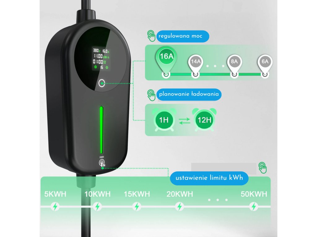 Najnowocześniejsza ładowarka nowej generacji 2026, wyłącznik różnicowoprądowy RCD typu B, automatyczne ustawienie ładowania do 80% za pomocą limitu naładowanych kWh, automatyczne wyłączanie, generowanie raportów do użytku prywatnego / firmowego – do księgowości i ewidencji przebiegu pojazdu, 24-godzinny timer, możliwość podłączenia do routera Wi-Fi i zdalnego sterowania przez Internet / chmurę, bezpłatna aplikacja mobilna Tuya / Smart Life na iOS / Android, monitorowanie mocy, czasu, energii, inteligentna funkcja 4-gears oraz inteligentne zarządzanie mocą w zależności od obciążenia innych urządzeń, maks. moc do 11 kW 3 × 16 A, min. moc 1,3 kW, niemal zerowe straty, beztlenowe przewody miedziane pokryte srebrem, wyposażona w wyświetlacz OLED, zabezpieczenie przed przepięciem, spadkiem napięcia, przegrzaniem, zwarciem, uderzeniem pioruna, podłączenie do standardowego czerwonego gniazda 5-bolcowego CEE 380/400 V 16 A, europejski wtyk ładowania Typ 2 Mennekes, odporność na wodę i kurz zgodnie z IP65, zastosowanie przenośne i stacjonarne w domu lub w podróży jako WallBox, certyfikaty CE, ROHS, COC, ISO, IP; w zestawie antystatyczne etui podróżne na suwak, uchwyt do montażu na ścianie, ściereczka czyszcząca, kołki rozporowe, śruby i instrukcja obsługi, długość kabla do 10 metrów.